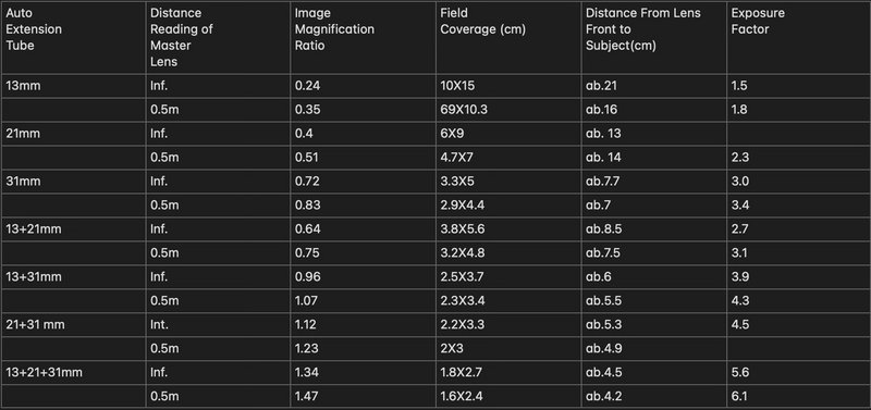 Segundo o manual, utilizando uma objectiva de 50mm temos a seguinte tabela que mostra as distância e o rácio de aumento/aproximação (Como não refere o factor de recorte, presumo que seja para uma máquina Full Frame com objectiva 50mm):